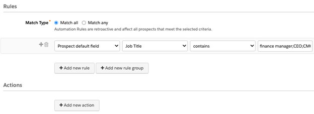 Create a rule that includes the field value that you have decided would cause the criterion to match. For example, you can use industry – If the prospect default field (job title) contains: finance manager; CEO; CMO etc. Key to note that the ‘contain’ option would only be used if the data you are after is not from a set picklist. Moreover, using a semicolon (;) between values means ‘or’ which is beneficial instead of having individual rules with a match any (or), you can separate them with the semicolon