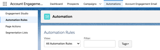 In MCAE lightning app, navigate to account engagement automations tab and click on automation rules