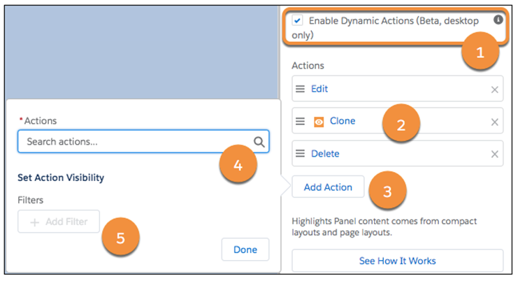 Dynamic Actions – With custom objects, you can utilise the Lightning App Builder to select which actions appear in the Highlights Panel of the record page, rather than relying on the page layout editor. You can also control the visibility of each action based on your specified criteria.