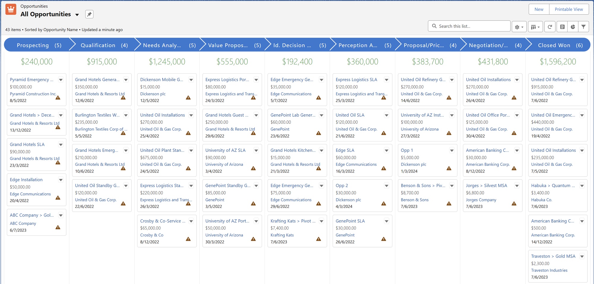 Example of Kanban views for Opportunities and custom objects list views: Opportunities in Kanban view.