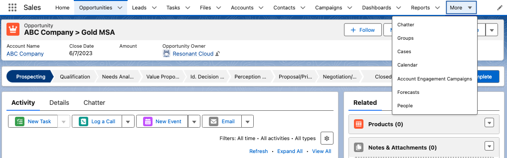 If you want to add more tabs than the ones that fit on the navigation bar – these get added as a drop down on the “More” tab. It’s worth noting however, that it is the apps that control the objects/tabs the users see here, so you can create and assign apps for different groups/types of users.